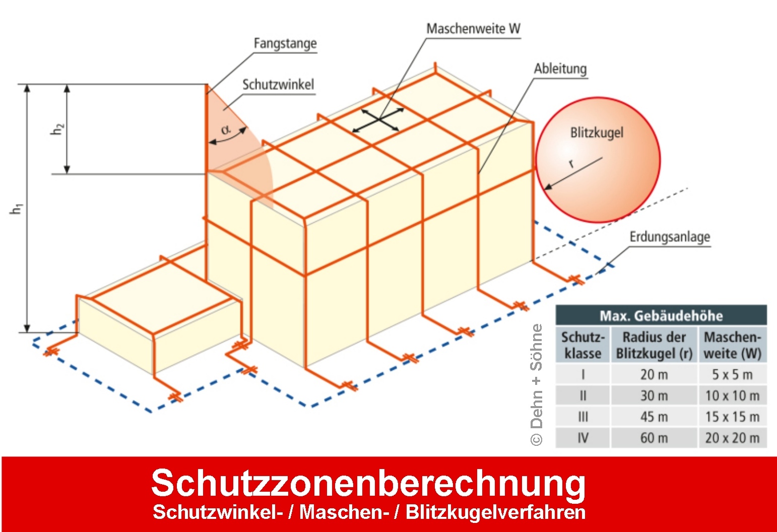 - die Lage der Fangeinrichtung (Schutzzone) kann mit Hilfe des Maschen- (ebenen Flächen), Schutzwinkel- (einfache Gebäude-Dachform) und Blitzkugel-Verfahrens (komplexe Gebäude-Dachform, Bestandteil der DIN EN 62305-3) bestimmt werden